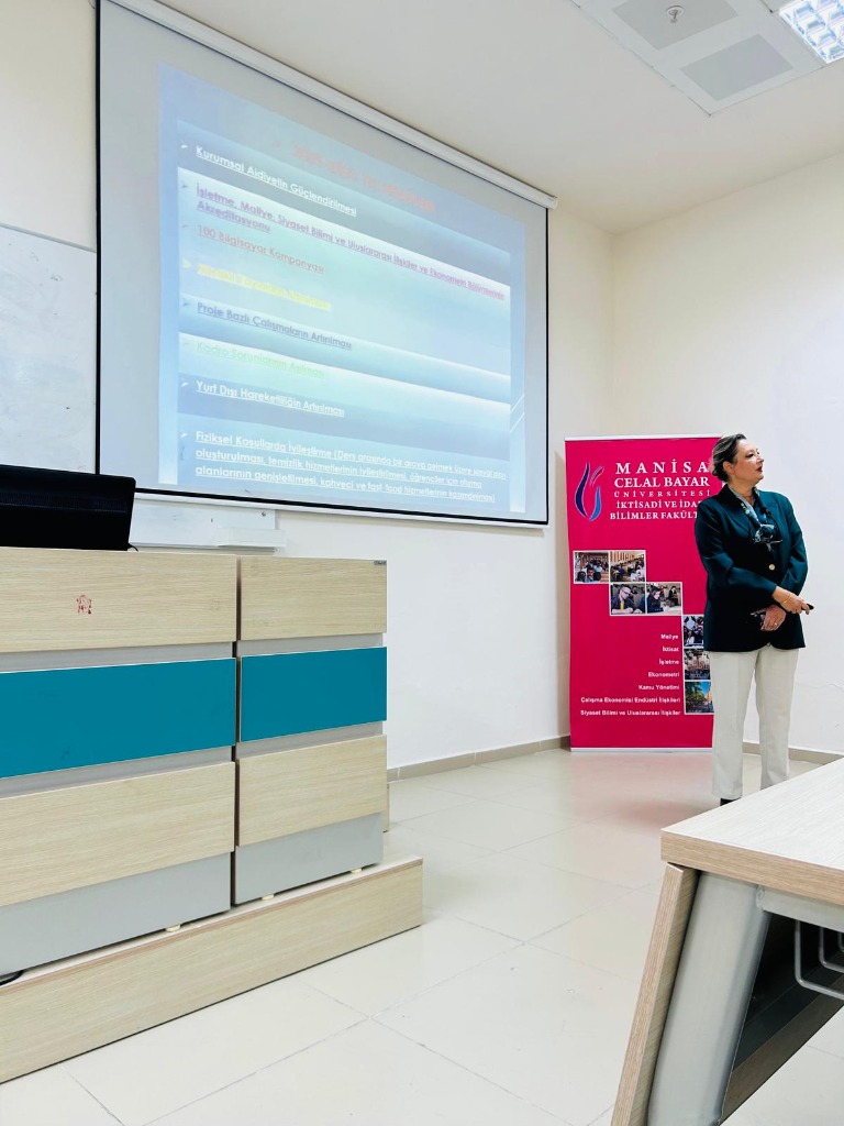 Dekanımız Prof.Dr. Asena ALTIN GÜLOVA, Dekan yardımcılarımız Prof.Dr. Tuncer ÖZDİL ve Dr. Öğr. Üyesi Murat DOĞAN’ın da hazır bulunduğu toplantıda açılış konuşmasının ardından 2024-2025 Akademik Yılını değerlendirdiği bir sunum yaptı. Öncelikle öğrencilerimiz, akademik ve idari personelimize ilişkin sayısal verilerin paylaşılmasının ardından, yıl boyunca unvan alan akademik personelimiz tebrik edildi. Bölümlerimiz ve öğrenci kulüplerimizin gerçekleştirdiği bilimsel etkinliklerin de değerlendirildiği toplantıda daha sonra yayın performansına katkıda bulunanlar paylaşıldı. Fakültemizin fiziksel koşullarına yönelik iyileştirmeler de ele alınan diğer başlıklar arasında yer aldı.